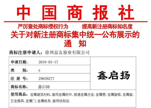 徐州益友門窗《鑫啟揚(yáng)》品牌已注冊(cè)商標(biāo)